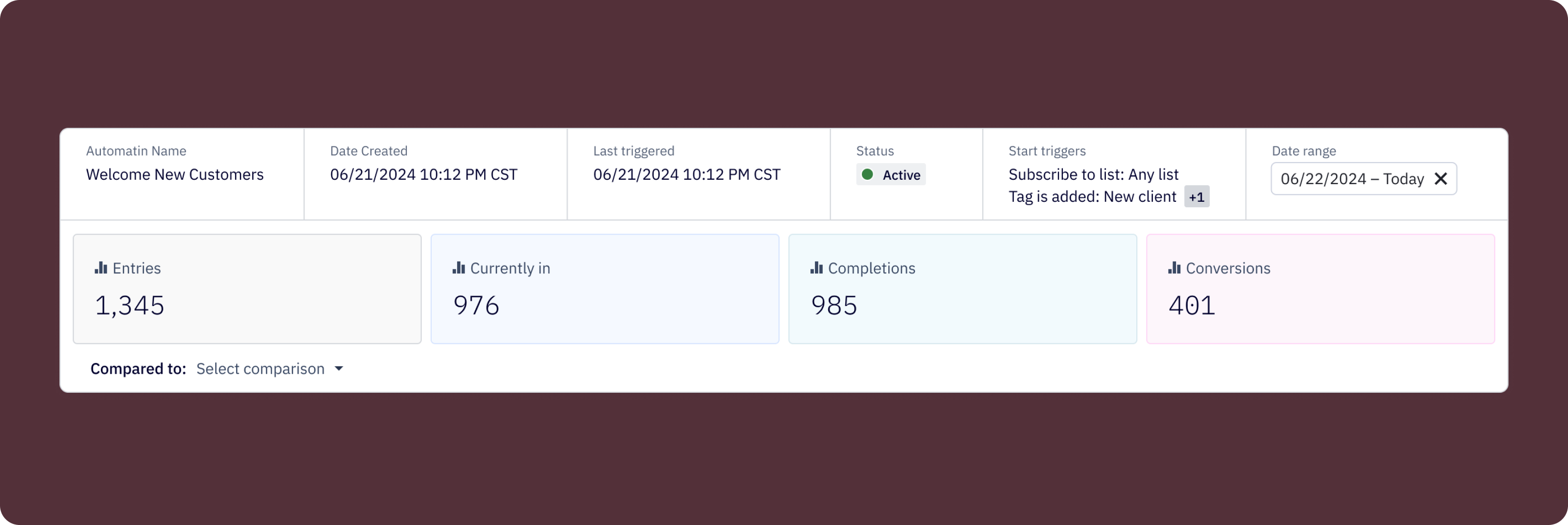 Users will see how many contacts have entered the automation, how many contacts are currently in the automation, how many have completed, and conversion. These key performance indicators (KPIs) allow users to see high level if the actions that determines the automation flow is generating conversions and revenue.