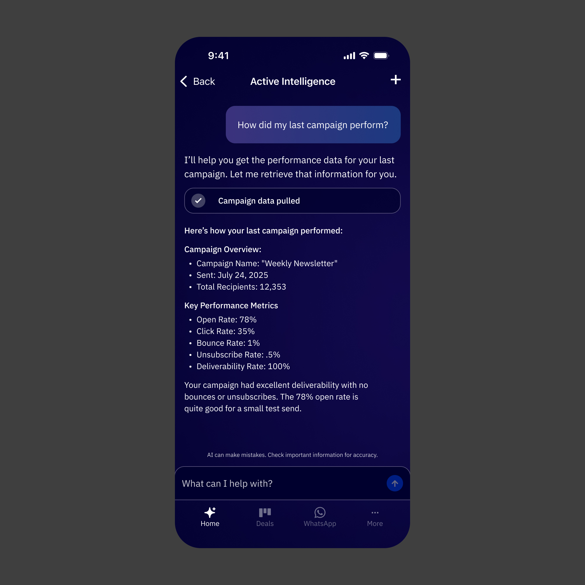 As ActiveCampaign evolved toward an autonomous, goal-aware platform, the mobile app fell behind. It lacked clear performance insights, offered limited visibility into key metrics, and didn't reflect how SMB owners actually work. They're often on the go, away from their desktops, and the app made it hard to understand marketing impact in real time.