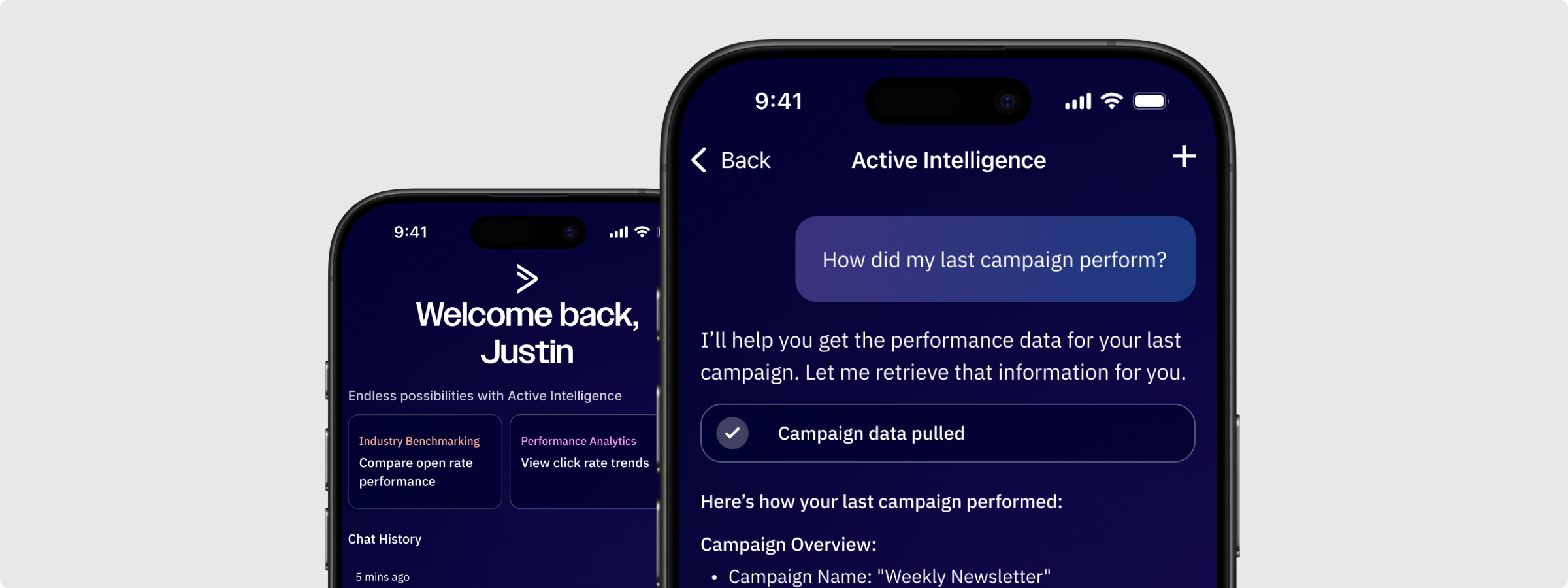 The web experience of Active Intelligence was designed with space to work with. Persistent navigation, wide layouts, multi-step creation flows with room to breathe. Mobile has none of that. Every surface we wanted to bring over had to be reconsidered from scratch. What does generating an AI campaign actually look like on a 390px canvas? How do you present business insights in a way that's scannable in 30 seconds? How does natural language search feel native to mobile rather than like a shrunken version of the web?